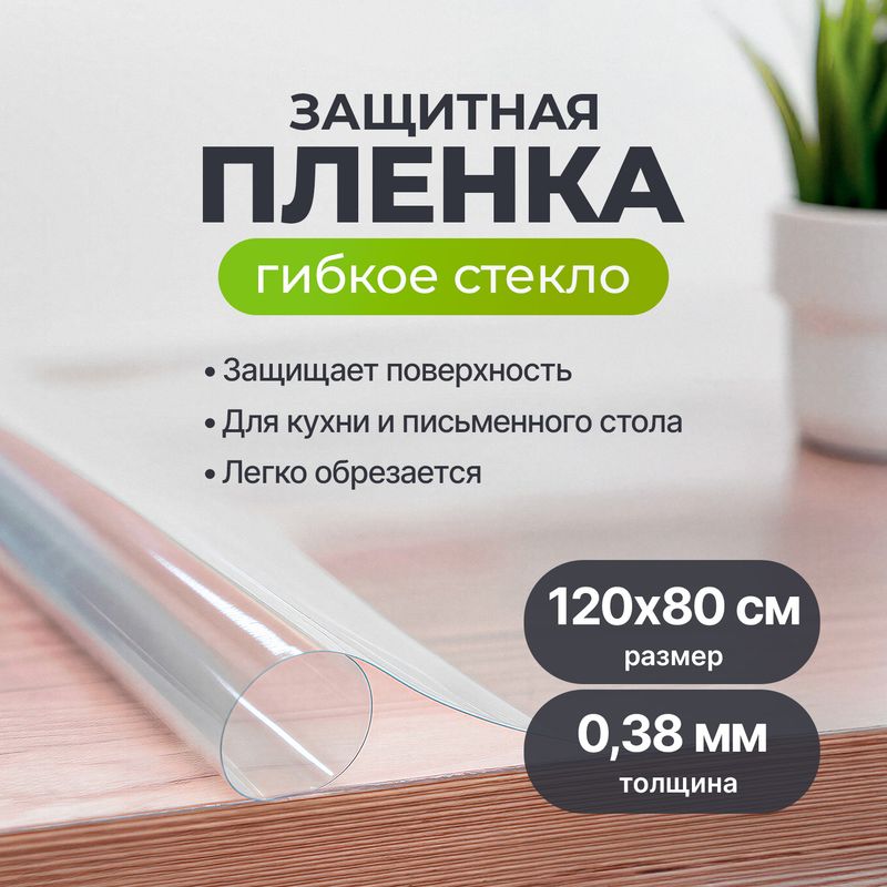 Плёнка защитная "Гибкое стекло", Home Time, подходит для разных поверхностей. Её можно использовать на кухне или положить на письменный стол во время рисования или лепки. Плёнку можно обрезать под нужный размер. Влагостойкая, прозрачная, долговечная. Перед применением ознакомьтесь с инструкцией и мерами предосторожности на упаковке. Размер: 120х80 см. Толщина: 0,38 мм. Состав: ПВХ.