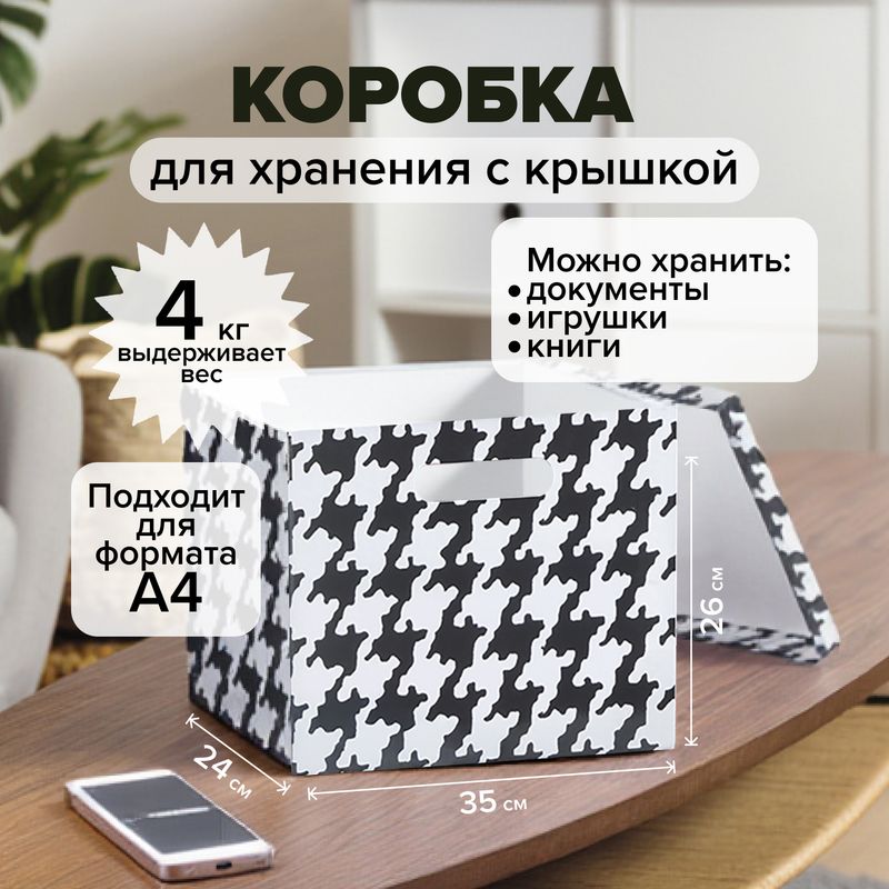 Коробка складная с крышкой, Home Time – отличное решение для хранения игрушек, обуви, книг и других вещей. Также подходит для документов формата А4. Коробка из трёхслойного картона с усиленными ручками выдерживает вес до 4 кг. Выполнена в стильном дизайне. Схема сборки указана на упаковке. Размер: 35х26х24 см. Состав: картон. Товар представлен в ассортименте.