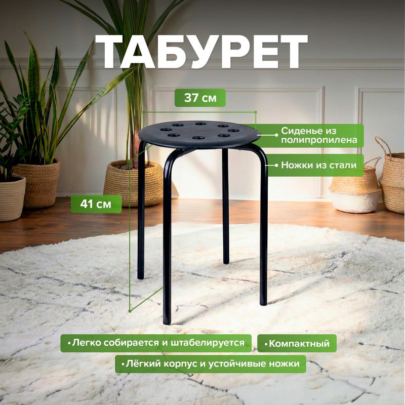 Табурет, Home time — компактное и практичное решение для дома и дачи. Лёгкий пластиковый корпус на устойчивых металлических ножках подходит для кухни, мастерской или балкона, легко собирается, штабелируется и не занимает много места при хранении. Размер: 37х41 см. Состав: полипропилен, углеродистая сталь.