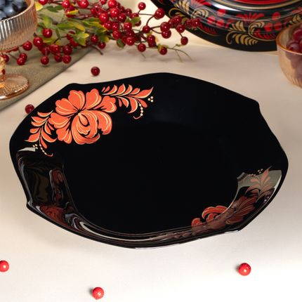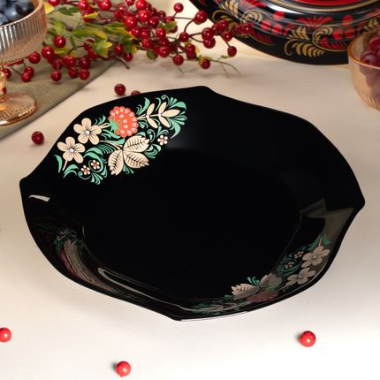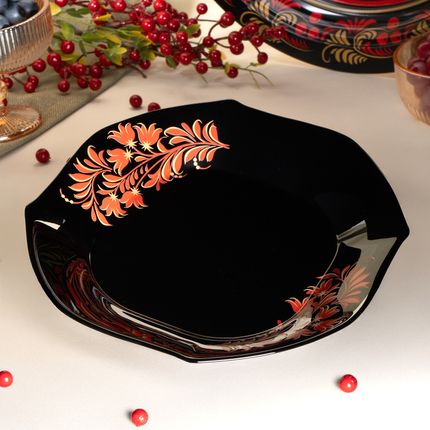 Арт. 5090688Тарелка, O'Kitchen, с традиционными узорами на тёмном фоне станет главным украшением стола! Подходит для подачи вторых блюд. Диаметр: 24 cм. Состав: опаловое стекло. Товар представлен в ассортименте. Волшебство узоров оживёт на Вашем столе с коллекцией «Жар-птица»!