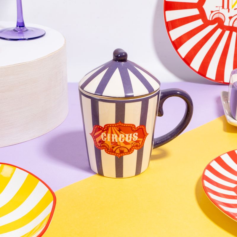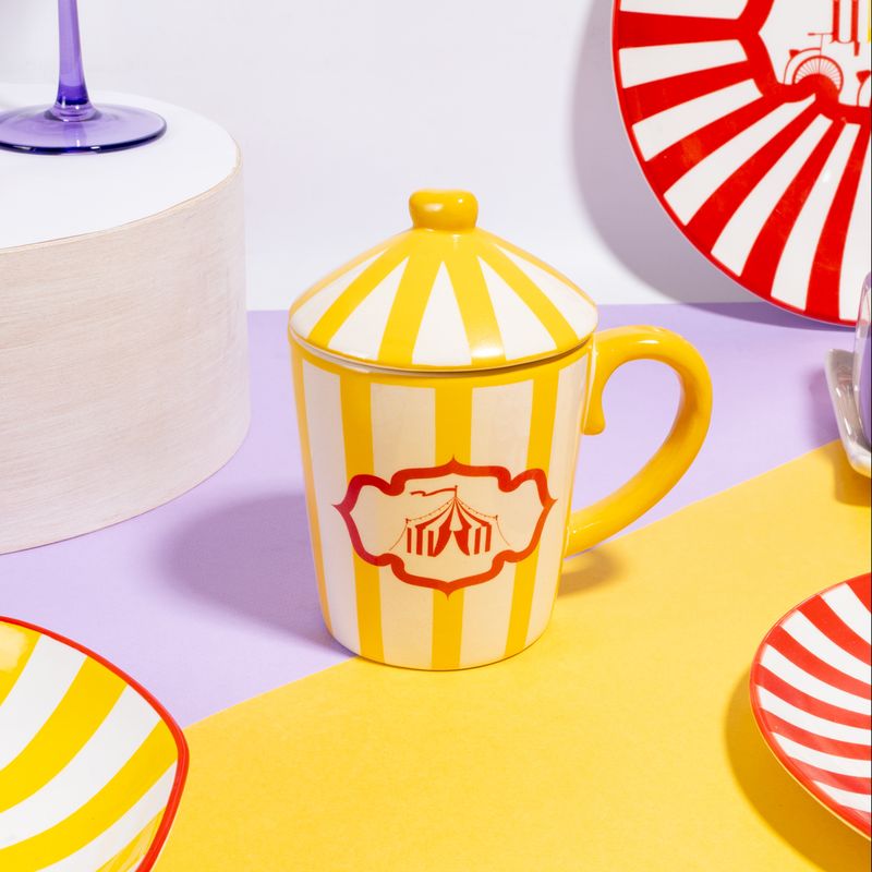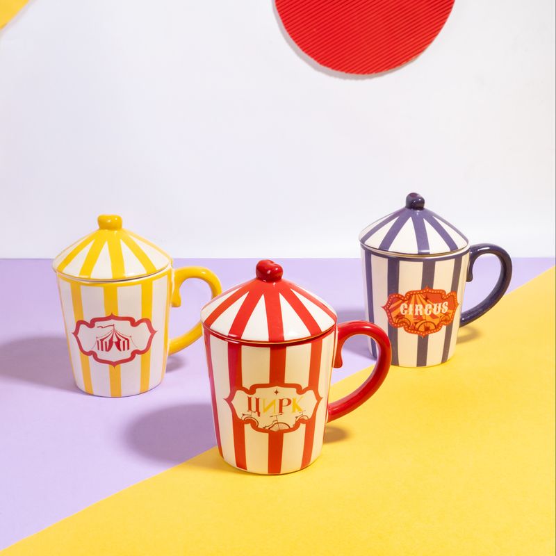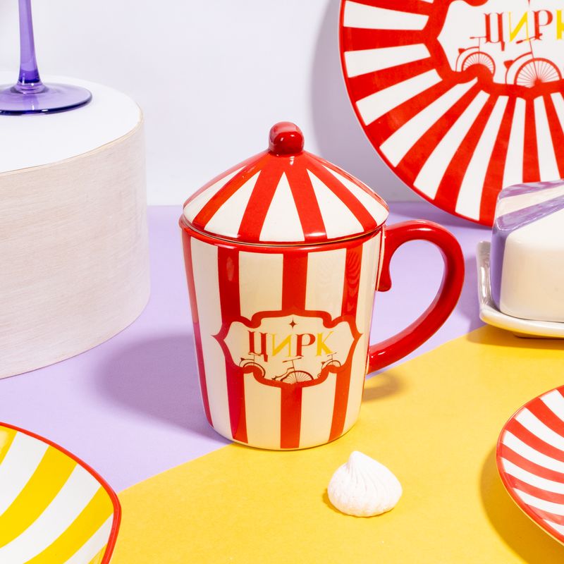Кружка с крышкой, O’Kitchen, украшена яркими полосами и куполами цирковых шатров. Создаёт настроение праздника с самого утра! Под крышкой напиток дольше сохраняет тепло. Объём: 380 мл. Состав: керамика. Товар представлен в ассортименте. Карнавал ярких красок в коллекции товаров для кухни "Цирк"!