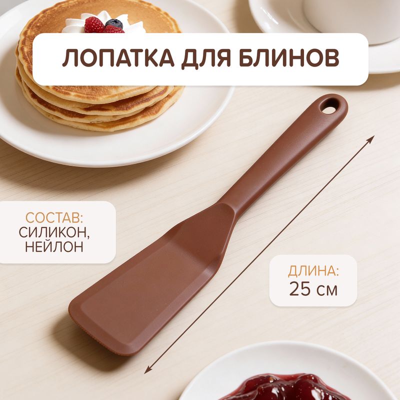 Лопатка для блинов, O'Kitchen, станет Вашим надёжным помощником в приготовлении блинчиков и оладушек. Длина: 25 см. Состав: силикон, нейлон. Товар представлен в ассортименте. Вы также можете приобрести блюдо с соусником (ЛК: 5094323), ёмкость для мёда (ЛК: 5036745), розетку для варенья (ЛК: 5094311), бутылку для масла и уксуса (ЛК: 5036753), сковороду (ЛК: 5095088), мерный стакан (ЛК: 5036750), половник (ЛК: 5092792), подставку под горячее (ЛК: 5024876), сахарницу (ЛК: 5094331), ёмкость для блендера (ЛК: 5036910), банку для сыпучих продуктов (ЛК: 5036911).