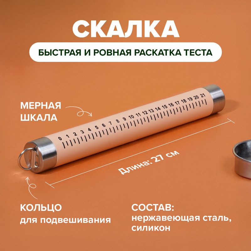 Скалка, O'Kitchen, с рабочей поверхностью из силикона поможет раскатать тесто быстро и ровно. Отлично подходит для выпечки, пельменей и мастики. Имеет удобную мерную шкалу и кольцо для подвешивания. Выдерживает температуру от -20 до +220 °С. Длина: 27 см. Состав: нержавеющая сталь, силикон. Товар представлен в ассортименте. Добавьте кухне уюта с коллекцией посуды и аксессуаров "Бабушкины рецепты".