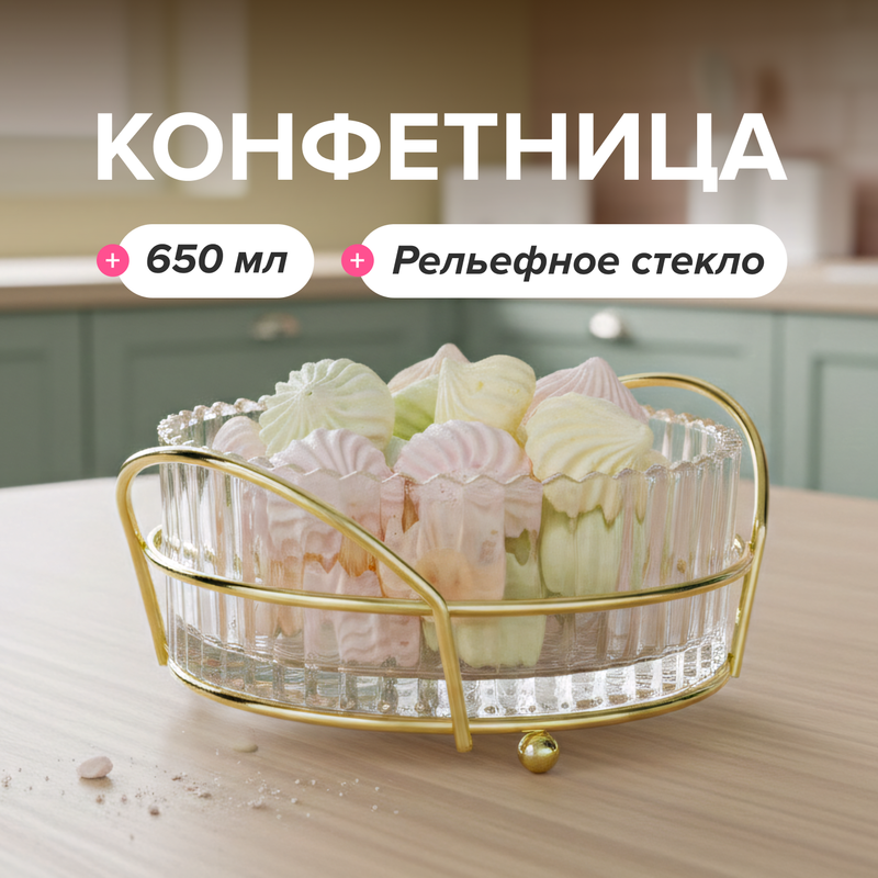 Конфетница, O'Kitchen, подойдёт для сервировки сладостей, орехов и сухофруктов. Украшена рельефным узором. Дополнена съёмной металлической подставкой. Объём: 650 мл. Состав: стекло, коррозионностойкая сталь.