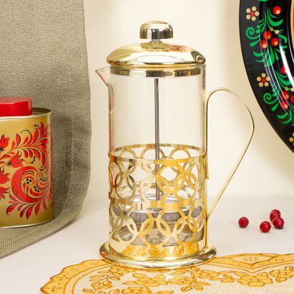 Арт. 5095060Френч-пресс, O'Kitchen, поможет заварить ароматный кофе или чай. Основание оформлено в золотом цвете с ажурным узором. Объём: 690 мл. Размер: 10,3×20,5 см. Состав: стекло, сталь, полипропилен. Волшебство узоров оживёт на Вашем столе с коллекцией «Жар-птица»!