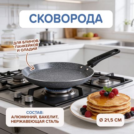 Арт. 5095088Сковорода, O'Kitchen, прекрасно подходит для приготовления блинчиков, панкейков и оладушек. Диаметр: 21,5 см. Состав: алюминий, бакелит, нержавеющая сталь. Товар представлен в ассортименте. Вы также можете приобрести блюдо с соусником (ЛК: 5094323), лопатку для блинов (ЛК: 5092785), ёмкость для мёда (ЛК: 5036745), розетку для варенья (ЛК: 5094311), бутылку для масла и уксуса (ЛК: 5036753), мерный стакан (ЛК: 5036750), половник (ЛК: 5092792), подставку под горячее (ЛК: 5024876), сахарницу (ЛК: 5094331), ёмкость для блендера (ЛК: 5036910), банку для сыпучих продуктов (ЛК: 5036911).