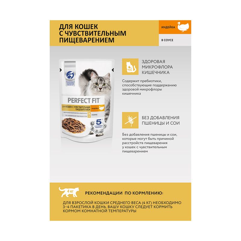 Влажный корм для кошек с чувствительным пищеварением, Perfect Fit, индейка в соусе, 75 г