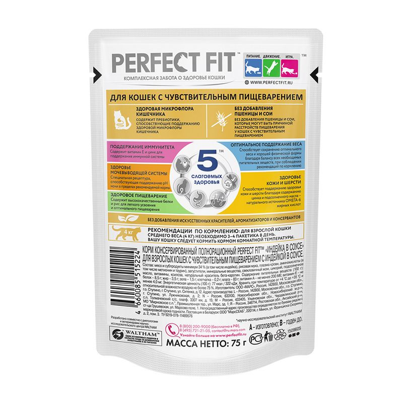 Влажный корм для кошек с чувствительным пищеварением, Perfect Fit, с индейкой в соусе содержит пребиотики для поддержания здоровой микрофлоры кишечника. Без добавления пшеницы и сои. Масса нетто: 75 г.