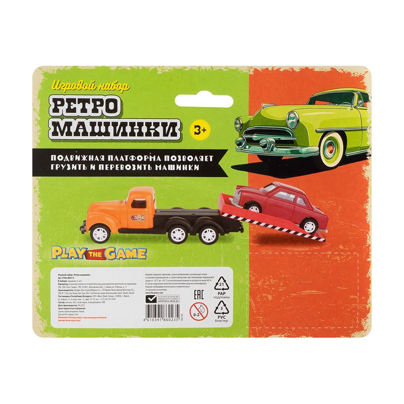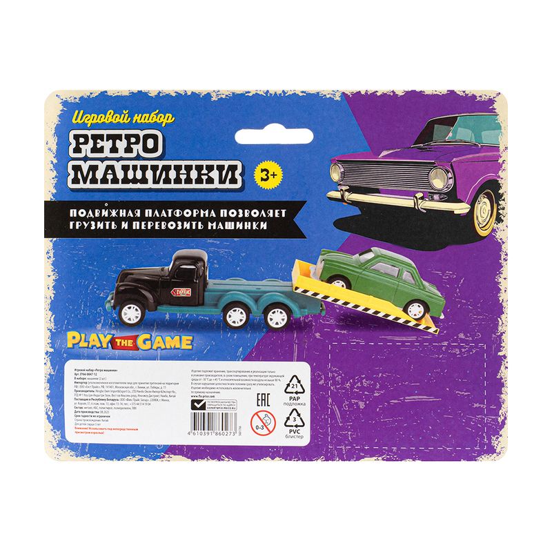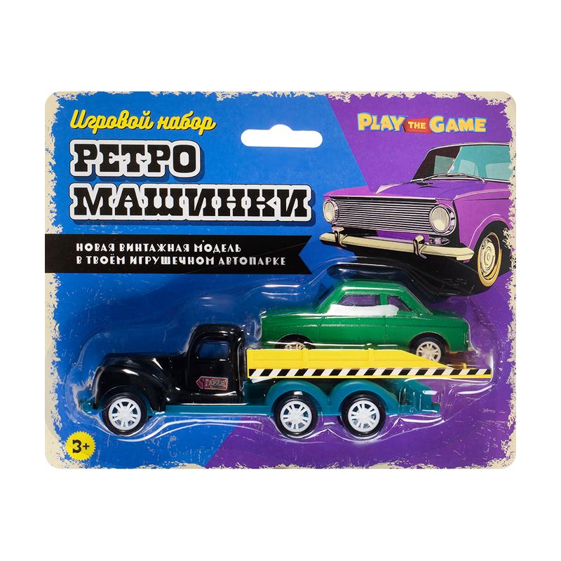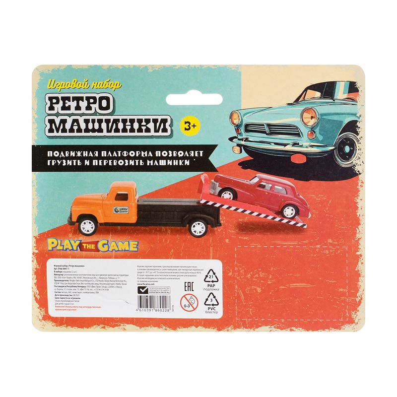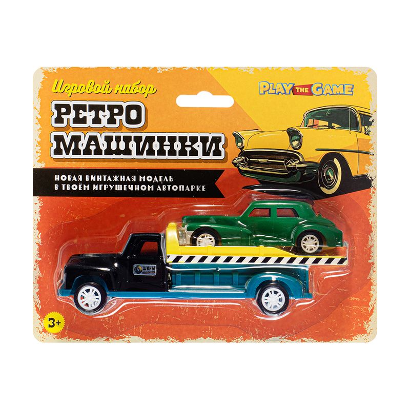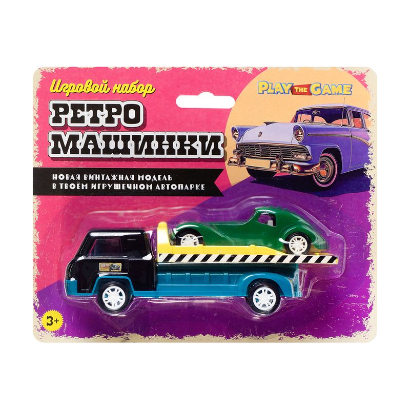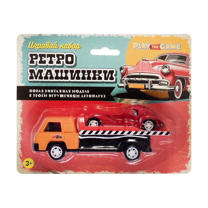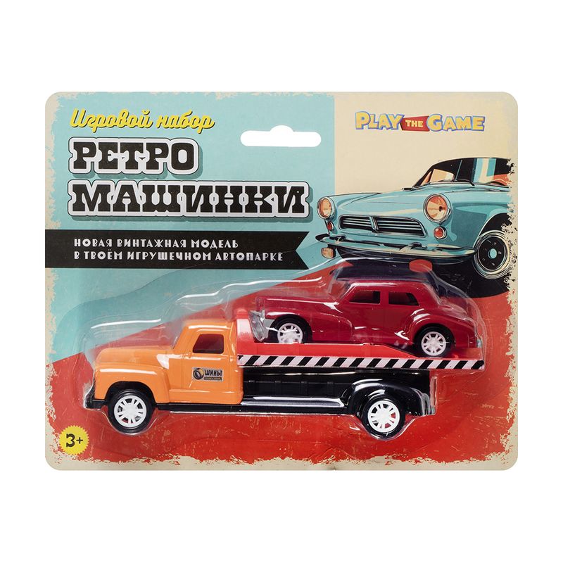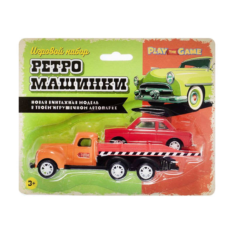 Игровой набор "Ретро-машинки", Play the Game, включает в себя 2 игрушечные модели машинок в ретро-дизайне. Одна из машинок оснащена подвижной платформой для погрузки и перевозки другой машинки. Для детей от 3 лет. Состав: металл, АБС, полистирол, полипропилен, ПВХ. Товар представлен в ассортименте.