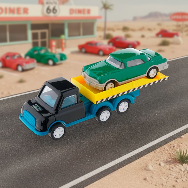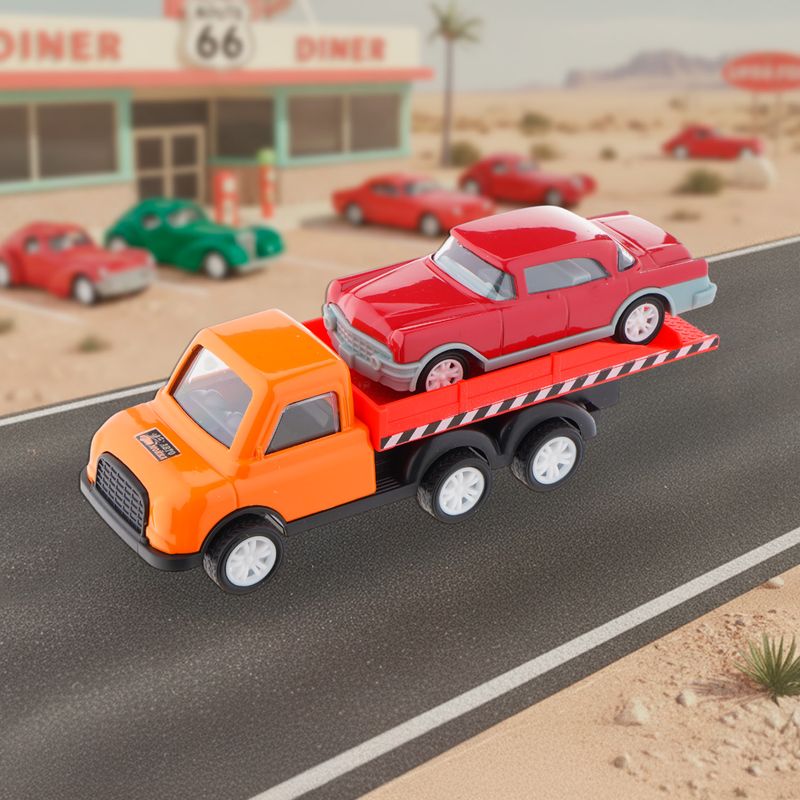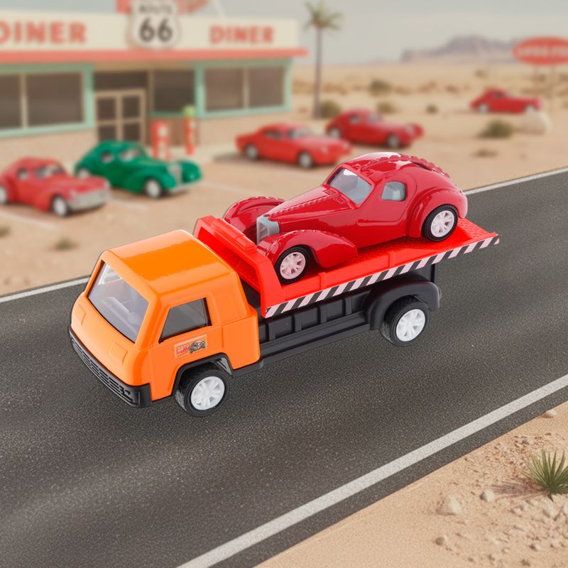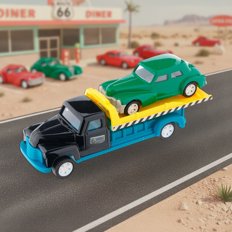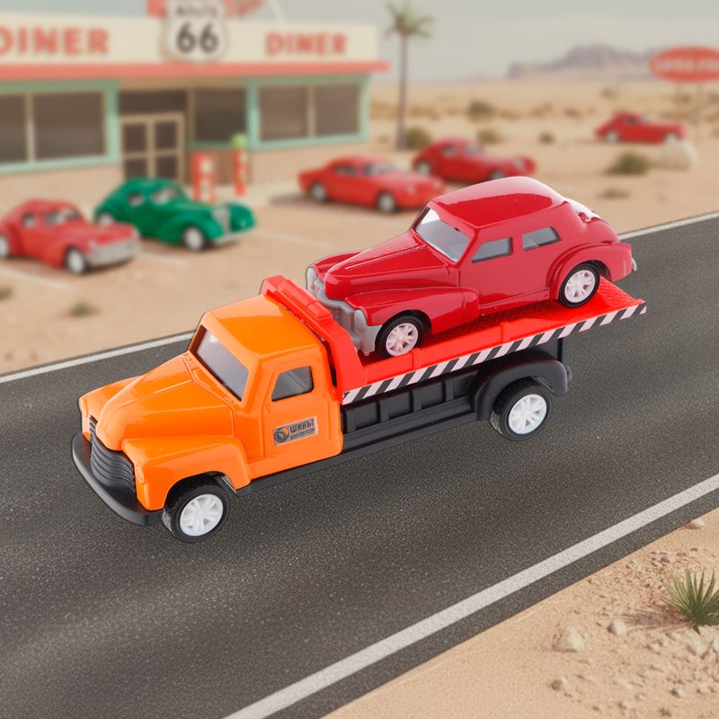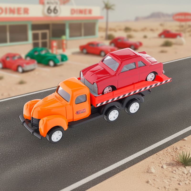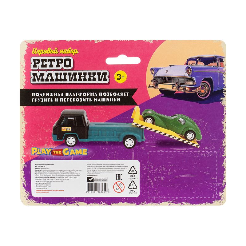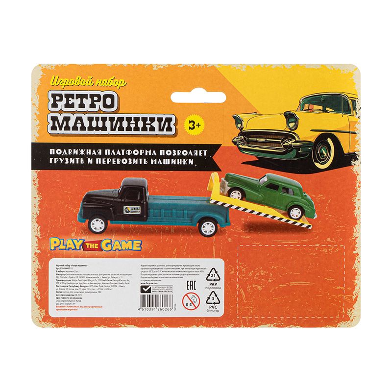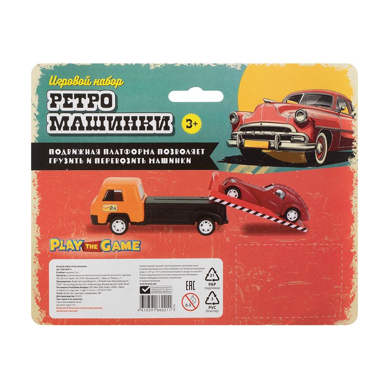 Игровой набор "Ретро-машинки", Play the Game, включает в себя 2 игрушечные модели машинок в ретро-дизайне. Одна из машинок оснащена подвижной платформой для погрузки и перевозки другой машинки. Для детей от 3 лет. Состав: металл, АБС, полистирол, полипропилен, ПВХ. Товар представлен в ассортименте.