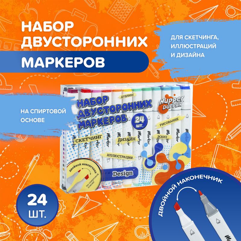 Набор двусторонних маркеров, Hupper Dupper, на спиртовой основе – отличный выбор для дизайна, скетчинга и иллюстраций. Маркер имеет двойной наконечник: тонкий для точных линий и скошенный для заливки и штриховки. В наборе 24 маркера. Товар представлен в ассортименте.