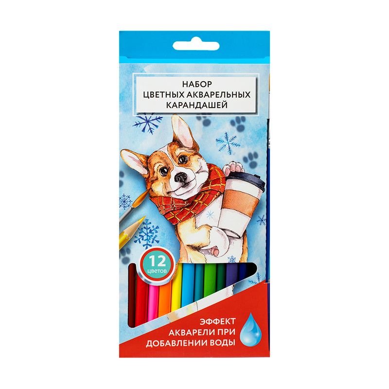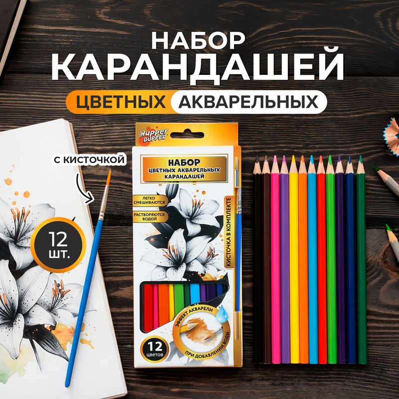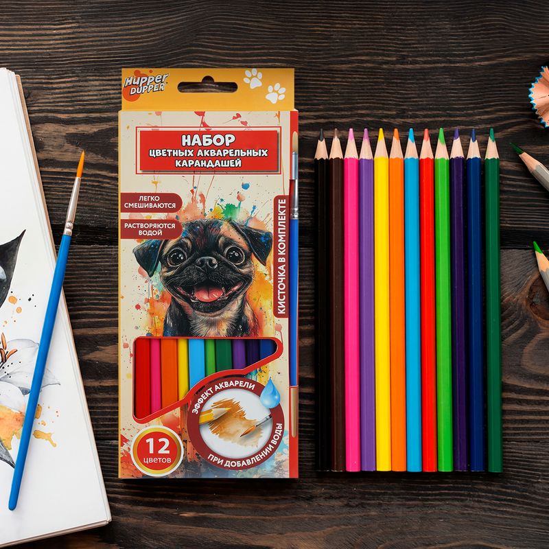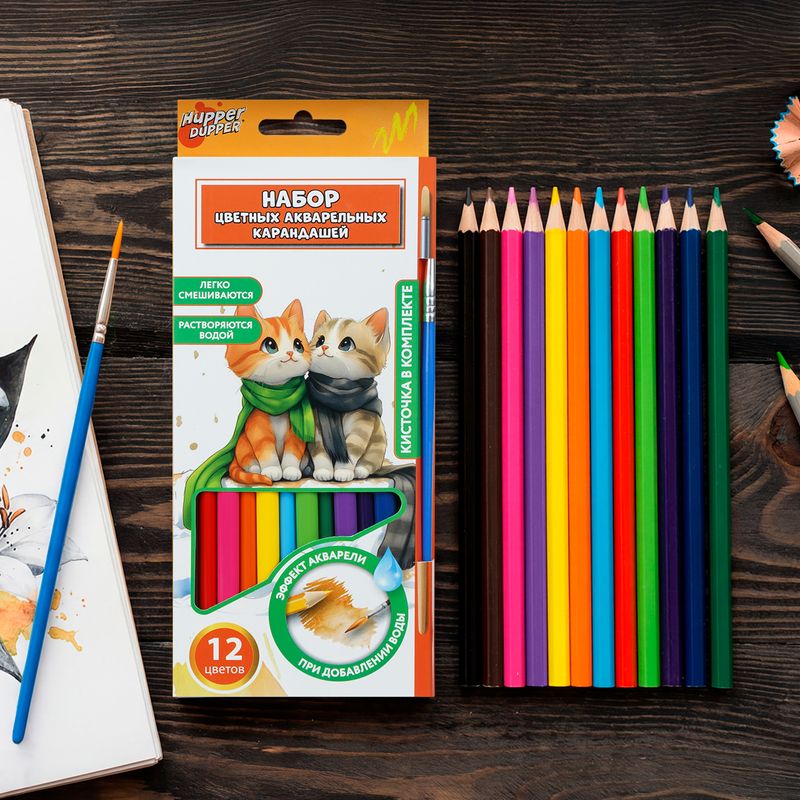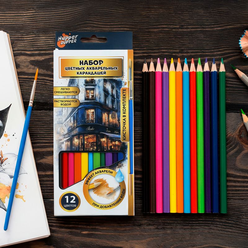 Набор цветных акварельных карандашей, 12 цветов, кисть в комплекте, в ассортименте