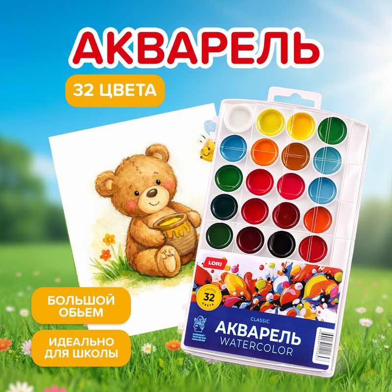 Акварель, LORI, подойдёт для рисования, творчества и занятий. Включает широкую палитру оттенков, которые легко смешиваются между собой и позволяют создавать выразительные работы. В палитре 32 цвета.