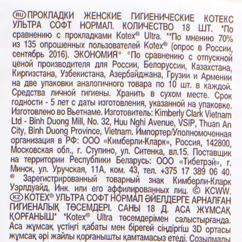 Прокладки "Ultra Soft", Kotex, 18 шт.
