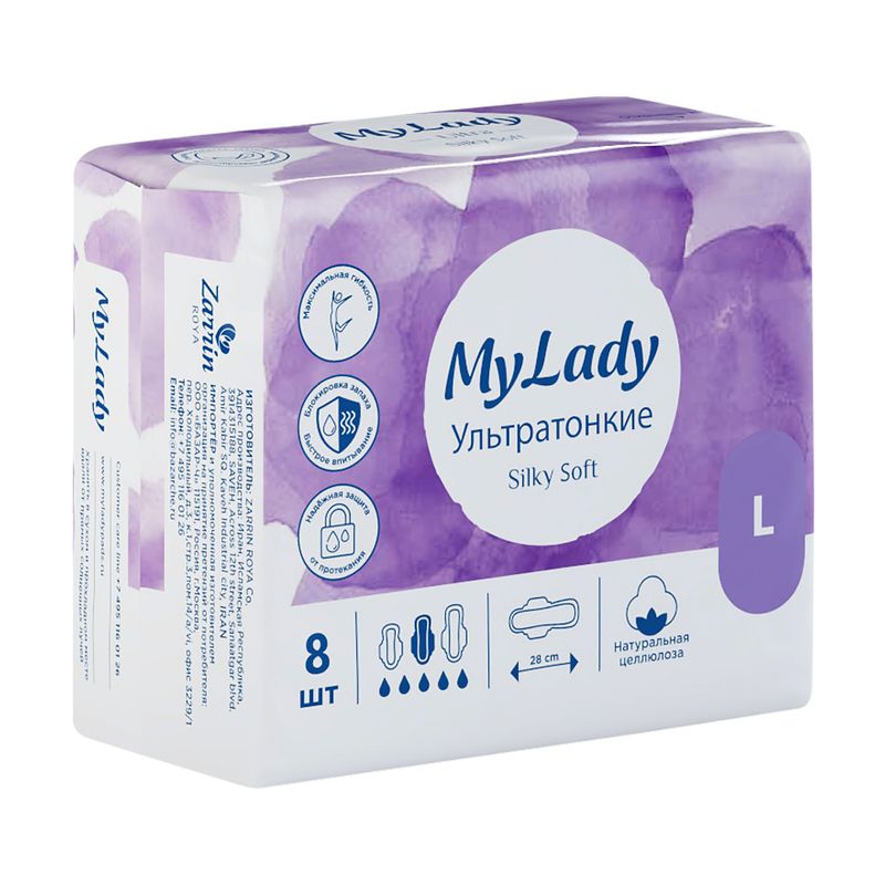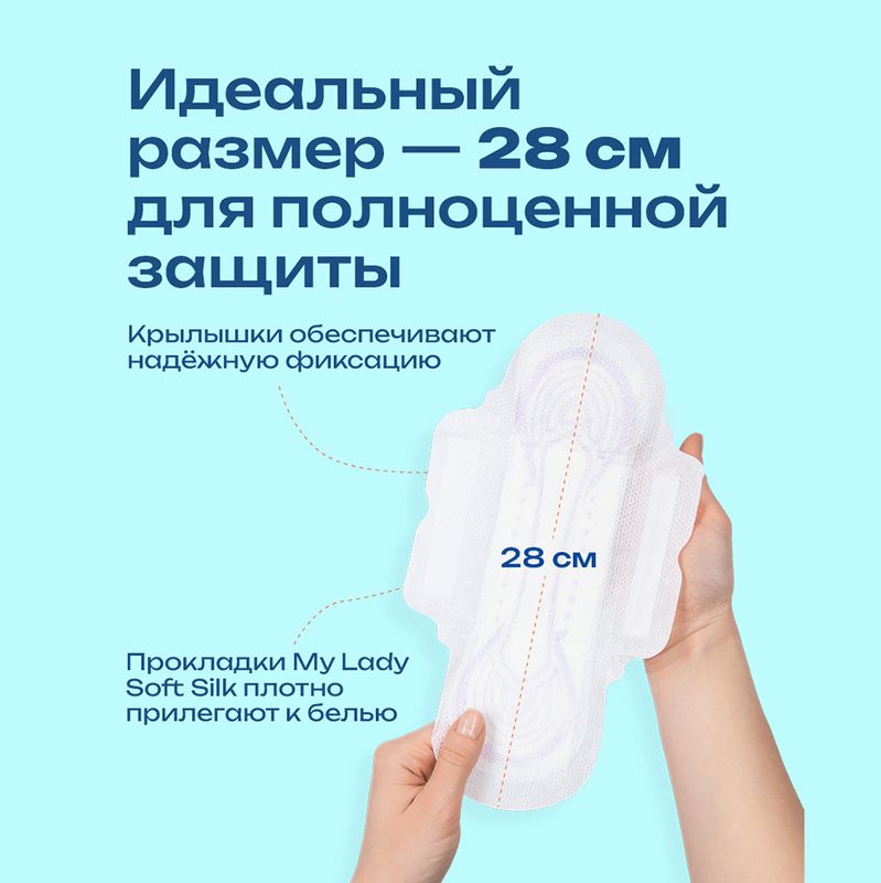 Прокладки "Silky Soft", My Lady, подарят ощущение комфорта и защищённости в критические дни. Подходят для чувствительной кожи. Впитываемость: 5/6. Длина: 28 см. В упаковке 8 прокладок размера L.
