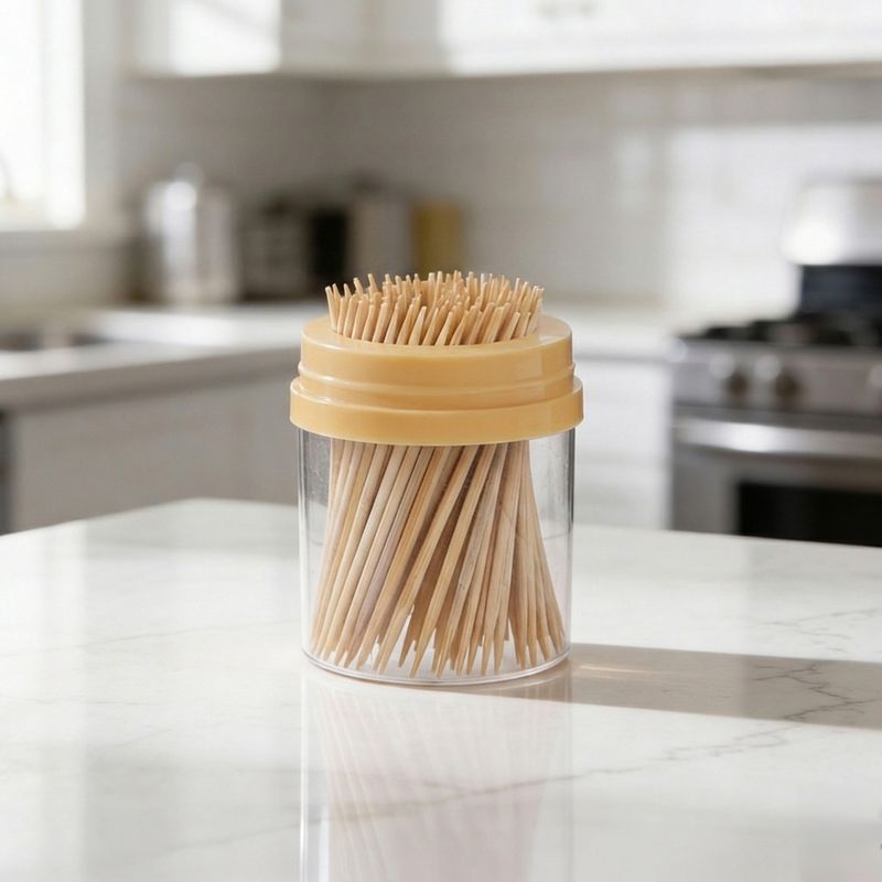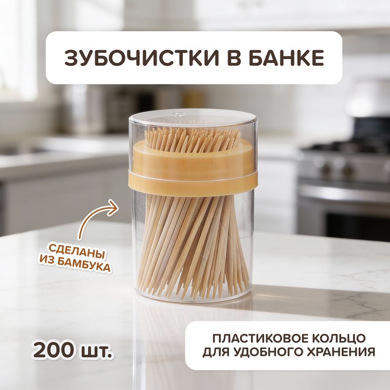 Зубочистки в банке — удобное и гигиеничное решение для очистки зубов после приёма пищи. Пластиковое кольцо в крышке контейнера облегчает доступ к зубочисткам и предотвращает их выпадение. Внутри 200 зубочисток из бамбука. Товар представлен в ассортименте.