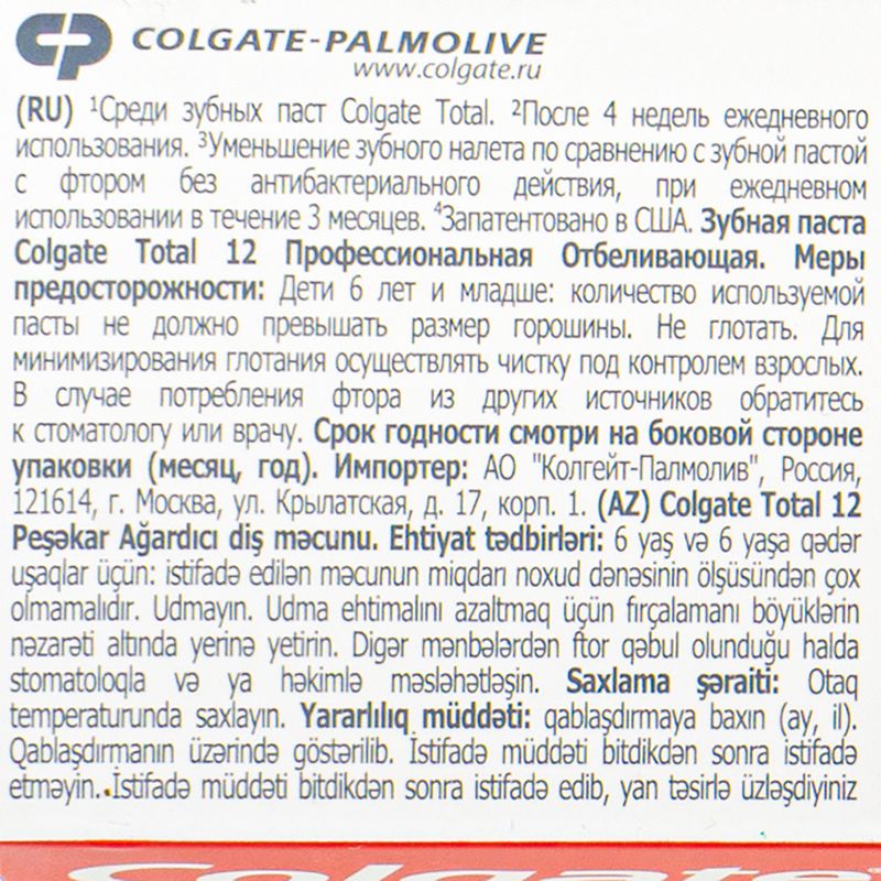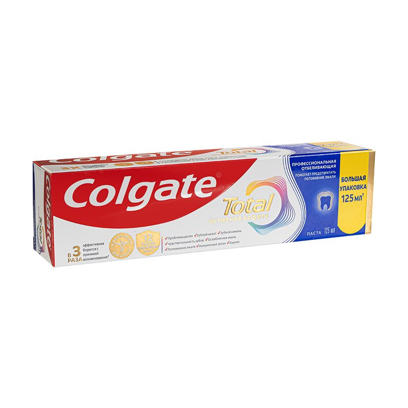 Зубная паста "Total", Colgate, обеспечивает антибактериальную защиту зубов, языка, щёк и дёсен на 12 часов. Подходит для ежедневного применения. Объём: 125 мл. Товар представлен в ассортименте.