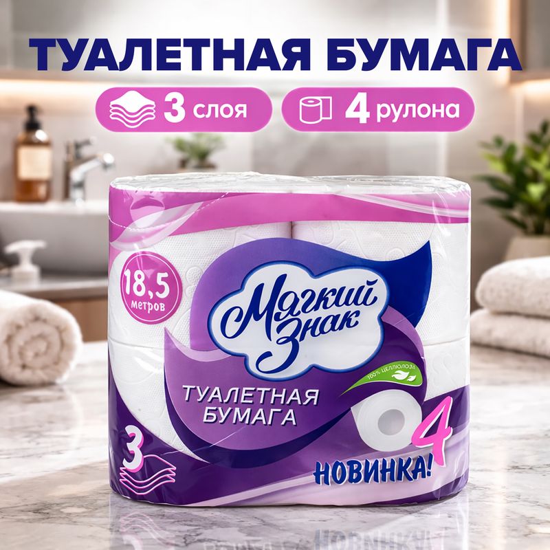 Туалетная бумага, Мягкий Знак, 3 слоя, 4 рулона