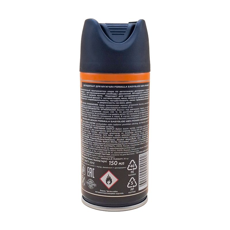 Дезодорант мужской "FORMULA EASYGLIDE" обеспечит защиту от запаха пота без ощущения липкости. Обладает приятным ароматом с нотками чёрного перца, амбры, пачули, корицы и кедра. Не оставляет белых следов. Не содержит солей алюминия. Перед использованием ознакомьтесь с инструкцией и мерами предосторожности на упаковке. Объём: 150 мл. Товар представлен в ассортименте.