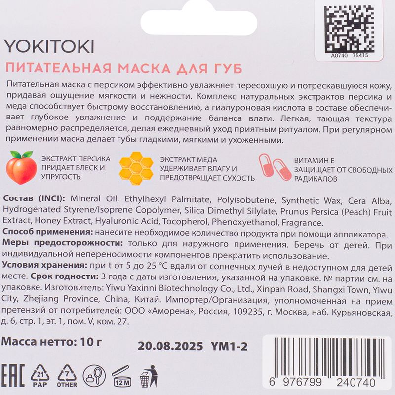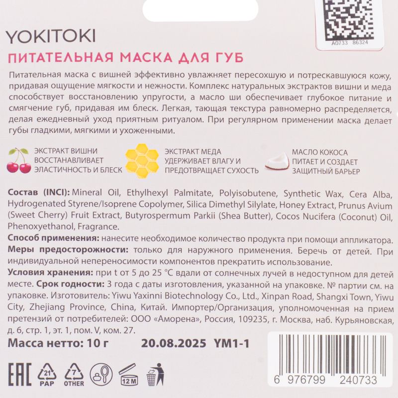 Маска для губ, YOKITOKI, 10 г, в ассортименте