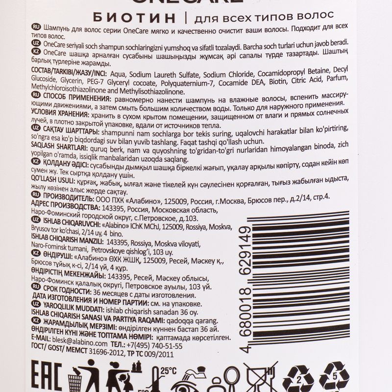 Шампунь для волос "One Care" не содержит силиконов и парабенов. Подходит для всех типов волос. Перед использованием ознакомьтесь с инструкцией и мерами предосторожности на упаковке. Объём: 500 мл. Товар представлен в ассортименте.