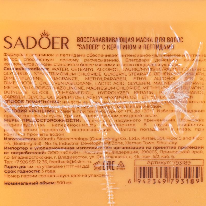 Маска восстанавливающая для волос, SADOER, с кератином и пептидами интенсивно увлажняет и питает волосы. Благодаря действию активных компонентов локоны становятся более мягкими и легко поддаются расчёсыванию и укладке. Перед использованием ознакомьтесь с инструкцией и мерами предосторожности на упаковке. Объём: 500 мл.