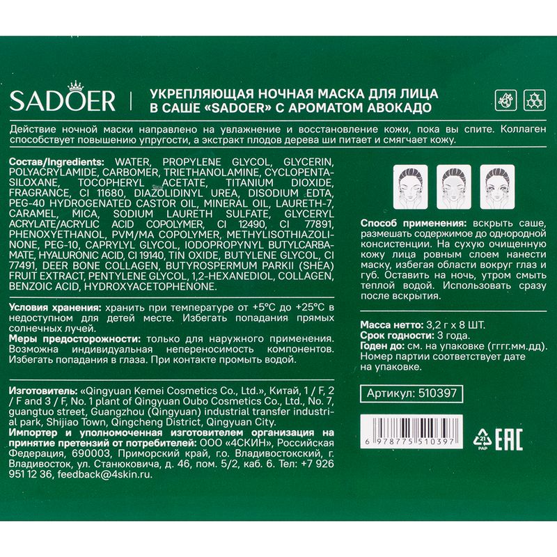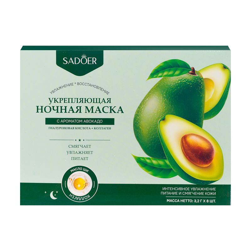 Маска для лица ночная, SADOER, авокадо, 8х3,2 г