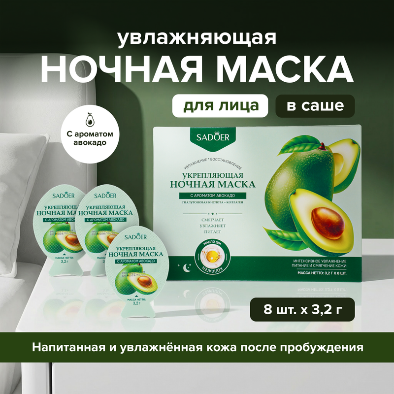 Маска для лица ночная, SADOER — ухаживающее средство для интенсивного питания и увлажнения кожи во время сна. Формула с ароматом авокадо, гиалуроновой кислотой и коллагеном помогает смягчить кожу, поддерживать её упругость и комфорт. Удобный формат саше подойдёт для курсового ухода и путешествий. В наборе 8 саше по 3,2 г. Перед использованием ознакомьтесь с инструкцией и мерами предосторожности на упаковке. Товар представлен в ассортименте.