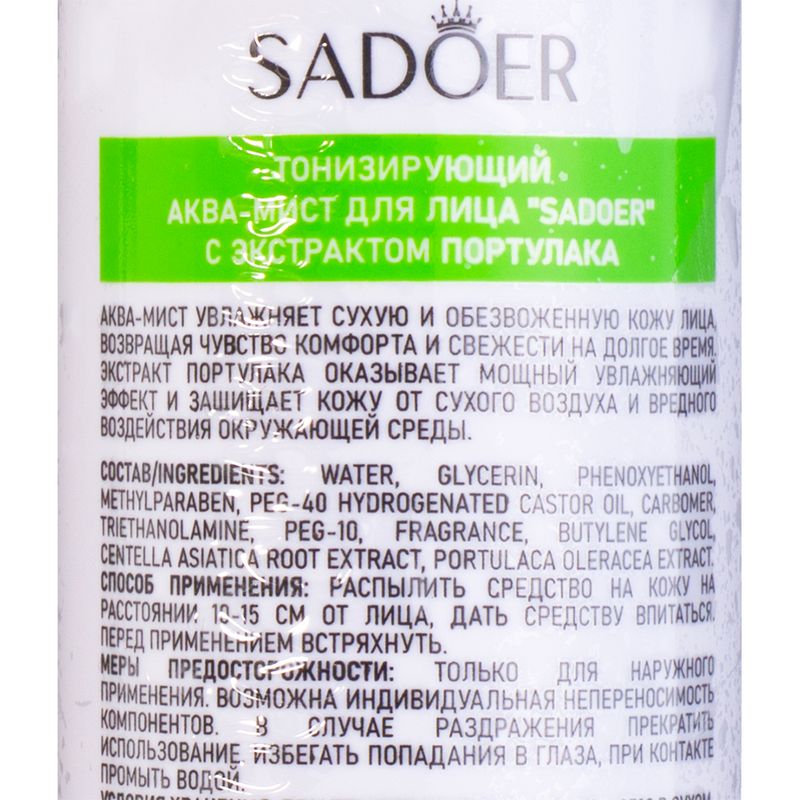 Аква-мист для лица тонизирующий, SADOER, помогает увлажнить кожу, возвращая чувство комфорта и свежести. Экстракт портулака защищает кожу от сухого воздуха и вредного воздействия окружающей среды. Перед использованием ознакомьтесь с инструкцией и мерами предосторожности на упаковке. Объём: 150 мл.
