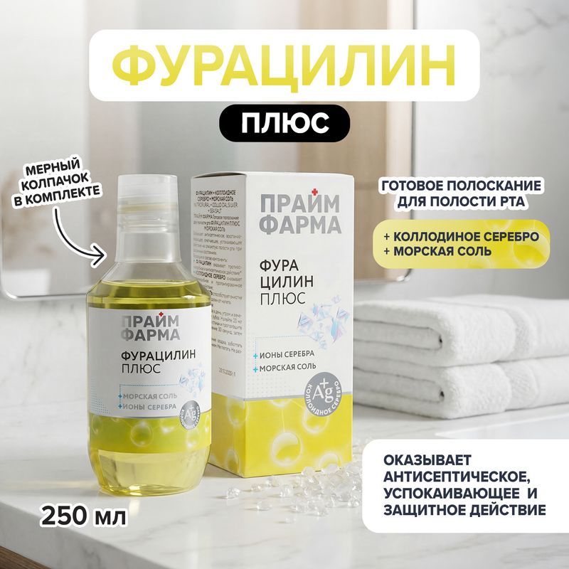 Готовое полоскание для полости рта "Фурацилин плюс" с коллоидным серебром и морской солью оказывает антисептическое, восстанавливающее и успокаивающее действие на слизистую полости рта. Средство незаменимо в сезон простуд! Мерный колпачок в комплекте. Перед использованием ознакомьтесь с инструкцией и мерами предосторожности на упаковке. Объём: 250 мл.