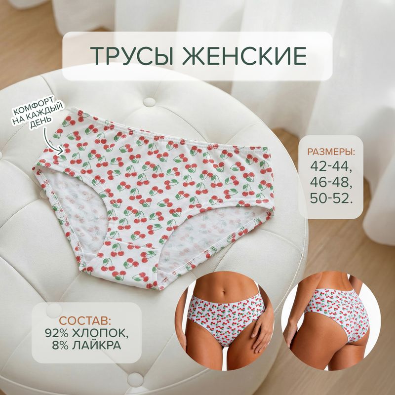 Трусы женские – комфортное бельё на каждый день. Слипы удобной посадки украшены милым принтом. Размеры: 42, 44, 46, 48, 50, 52. Состав: 92% хлопок, 8% лайкра. Товар представлен в ассортименте.