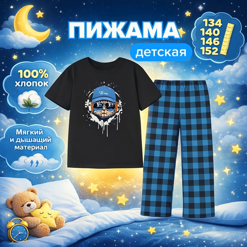 Пижама детская – это стильный домашний комплект для Вашего ребёнка. Футболка и брючки с эластичным поясом прекрасно подходят для комфортного сна и отдыха! Размеры: 134, 140, 146, 152. Состав: 100% хлопок. Товар представлен в ассортименте.