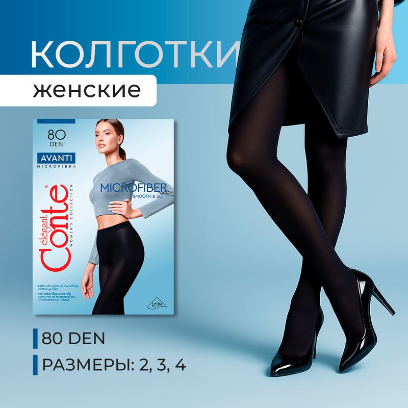 Колготки, Conte, отличаются удивительной мягкостью благодаря сочетанию нитей микрофибры и Lycra. Прекрасно подходят для повседневной носки. Колготки с плоским швом и хлопковой ластовицей обеспечивают комфорт и отлично сидят по фигуре. Плотность: 80 den. Размеры: 2, 3, 4. Цвет: чёрный.