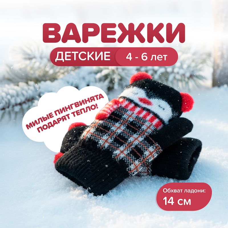 Варежки детские, Kids, в виде милых пингвинят согреют ручки ребёнка и подарят ему отличное настроение! Обхват ладони: 14 см (возраст: 4-6 лет). Состав: внешний слой – 48% полиамид, 45% полиэстер, 6% акрил, 1% эластан; подкладка – 100% полиэстер. Товар представлен в ассортименте.