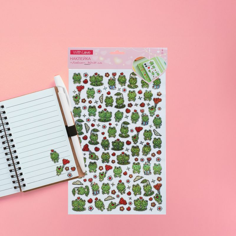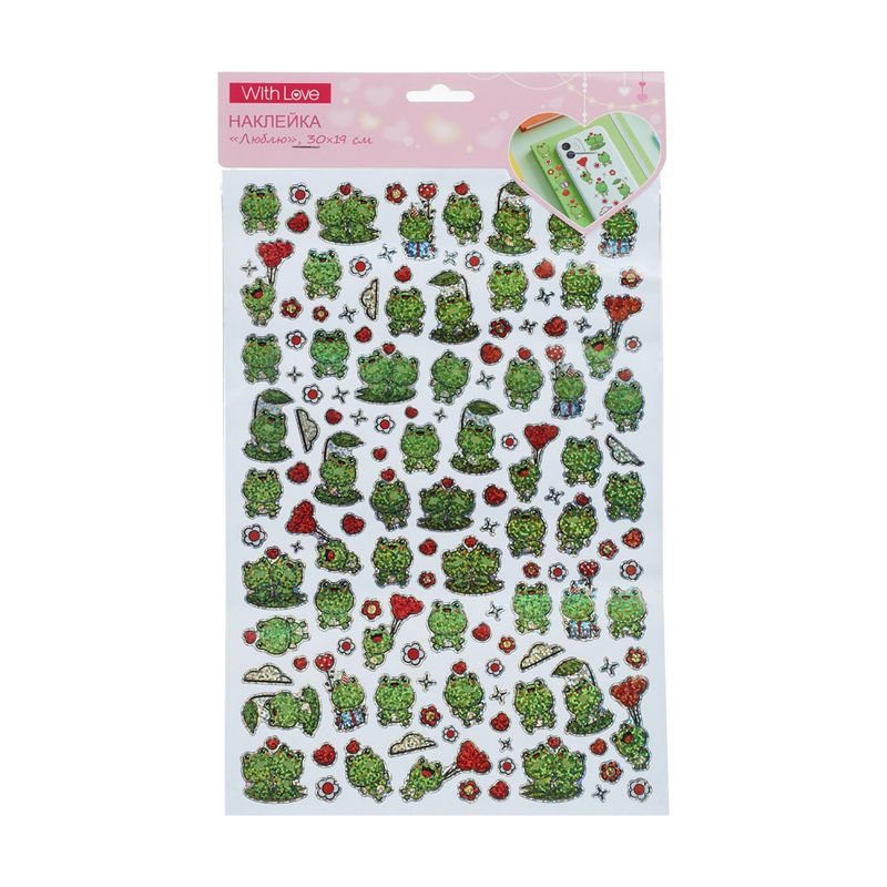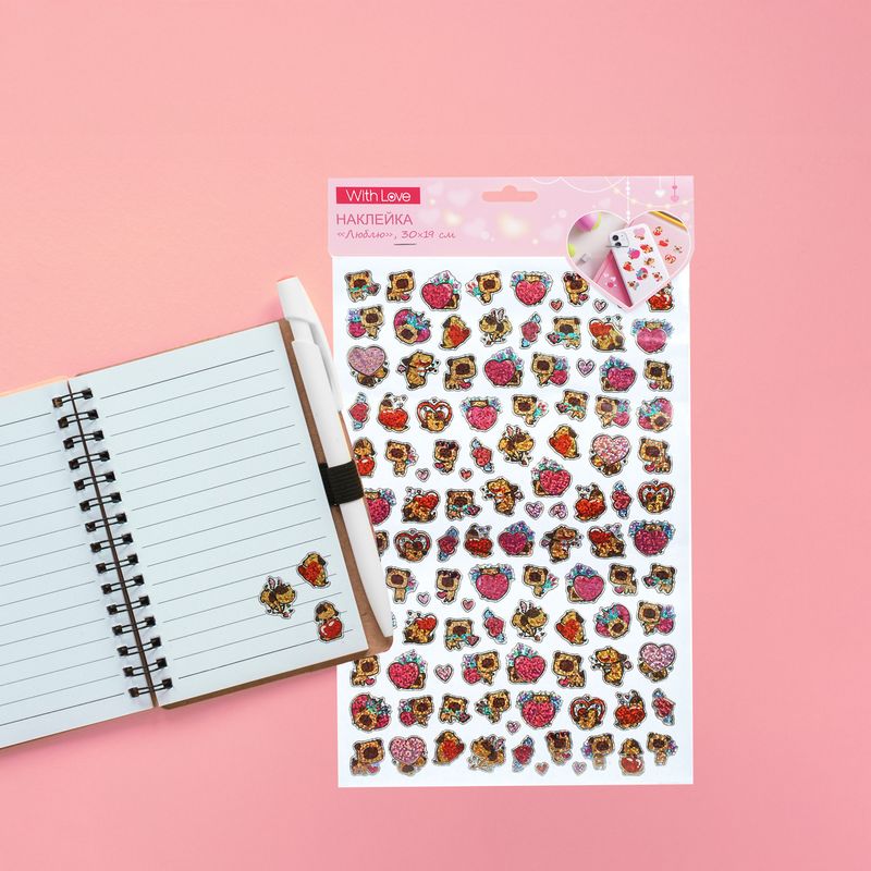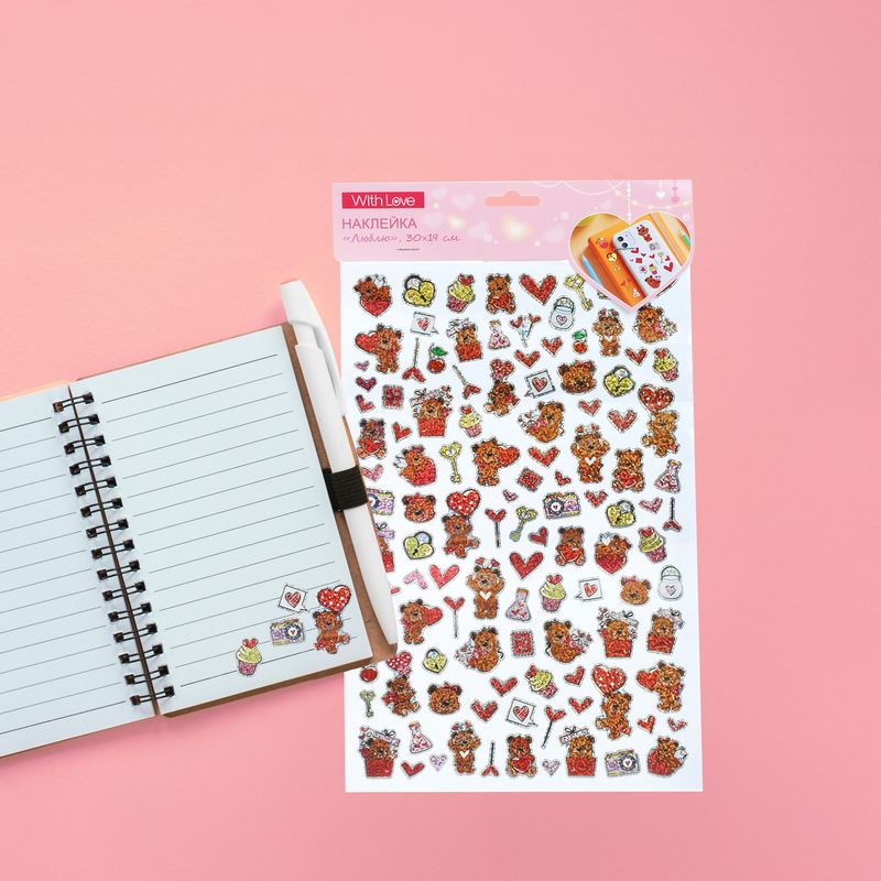 Наклейка "Люблю", With Love, подойдёт для украшения упаковок, открыток или предметов интерьера. В наборе яркие и блестящие наклейки с изображениями милых персонажей. Размер листа: 30×19 см. Состав: ПВХ, бумага. Товар представлен в ассортименте.