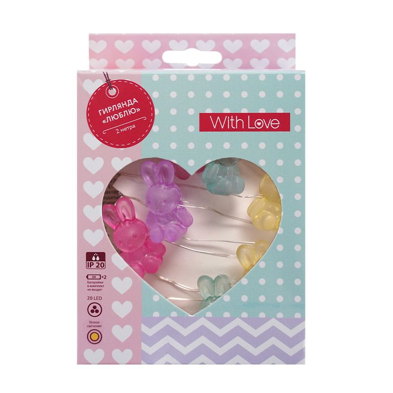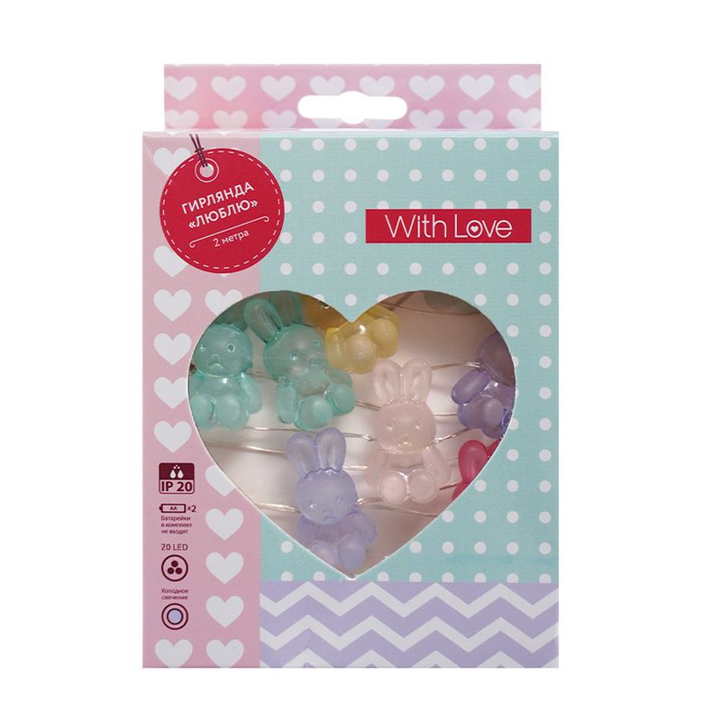 Гирлянда "Люблю", With Love, сделана в форме зайчиков, напоминающих цветные карамельки! Оригинальный декор для комнаты. Перед использованием ознакомьтесь с инструкцией и мерами предосторожности на упаковке. 20 светодиодов. Длина: 2 метра. Работает от двух батареек АА, не входят в комплект. Без световых эффектов. Состав: акрил, полистирол, медь, ПВХ, сталь. Товар представлен в ассортименте.