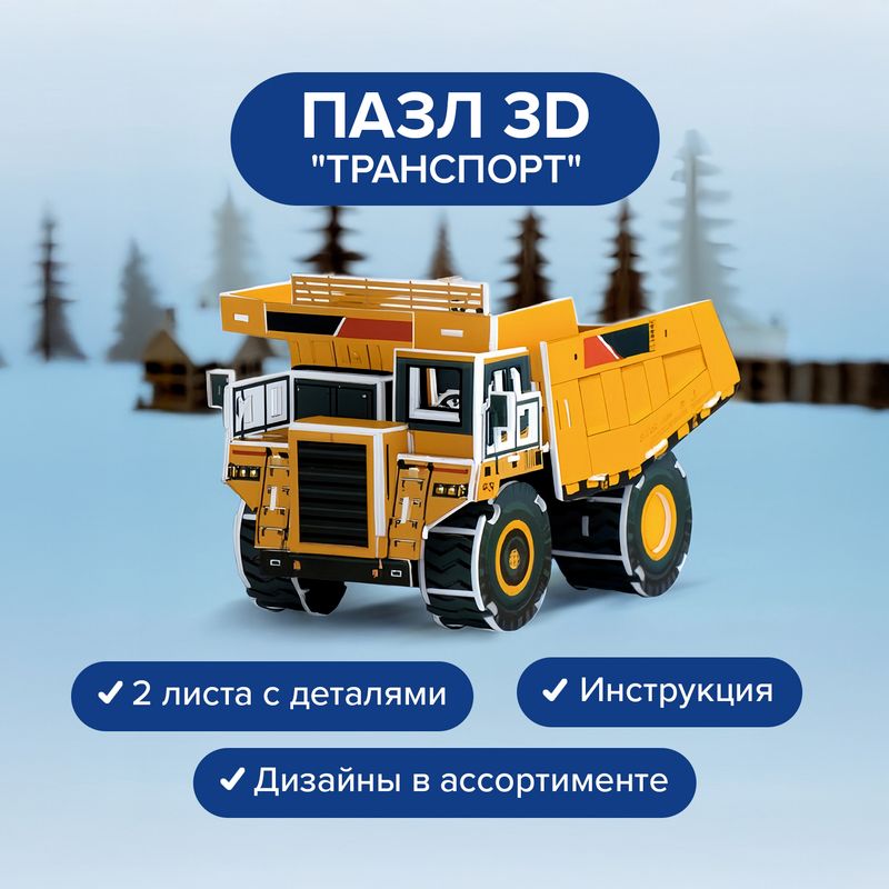3D-пазл "Транспорт" – отличный подарок для юного любителя строительной и грузовой техники! В наборе 2 листа с деталями пазла, палочка для их выдавливания и инструкция по сборке. Для детей от 3 лет. Состав: полистирол, бумага. Товар представлен в ассортименте. Соберите всю коллекцию!