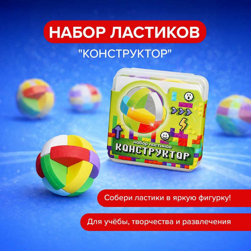 Набор ластиков "Конструктор" – это забавный и полезный подарок, который пригодится ребёнку в учёбе и творчестве! Яркие ластики можно собрать в геометрическую фигурку. Отличный подарок для мальчика! Инструкция по сборке указана на упаковке. Количество деталей зависит от выбранного набора. Для детей от 3 лет. Состав: термопластичная резина. Товар представлен в ассортименте.