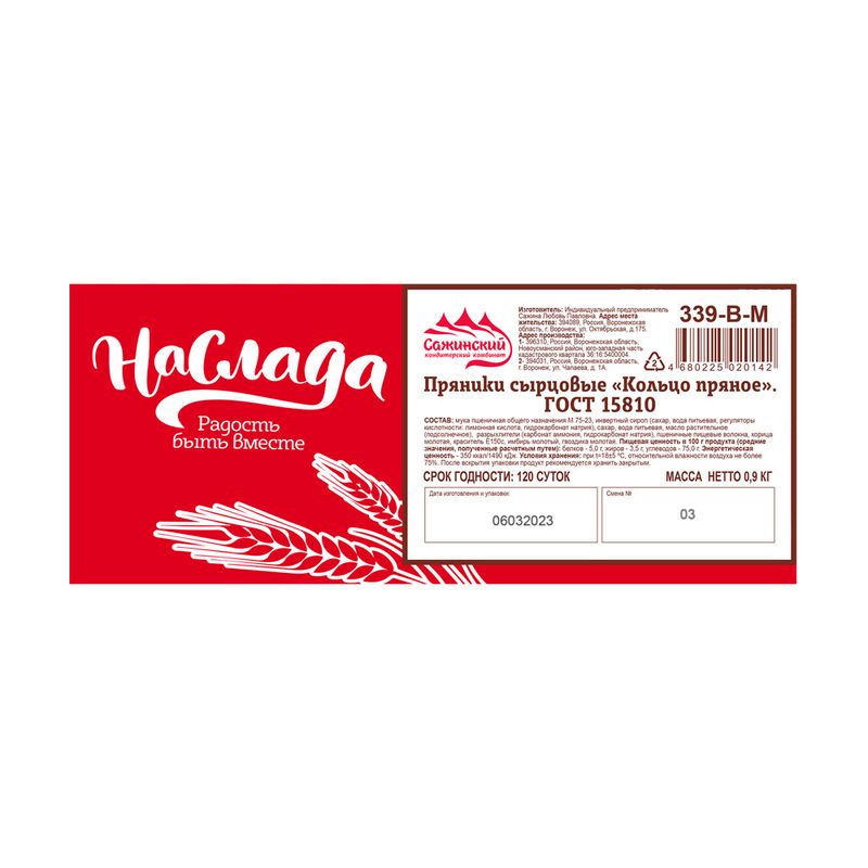 Сырцовые пряники "Кольцо пряное", Наслада, 900 г