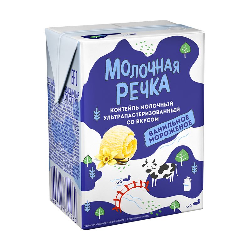 Молочный коктейль, Молочная Речка – это десертный напиток с нежным вкусом и ароматом ванильного мороженого. Подарите себе сливочное удовольствие! Благодаря трубочке и компактной упаковке его удобно брать с собой. БЗМЖ (без заменителей молочного жира). Ультрапастеризованный. Массовая доля жира: 2%. Объём: 0,2 л.
