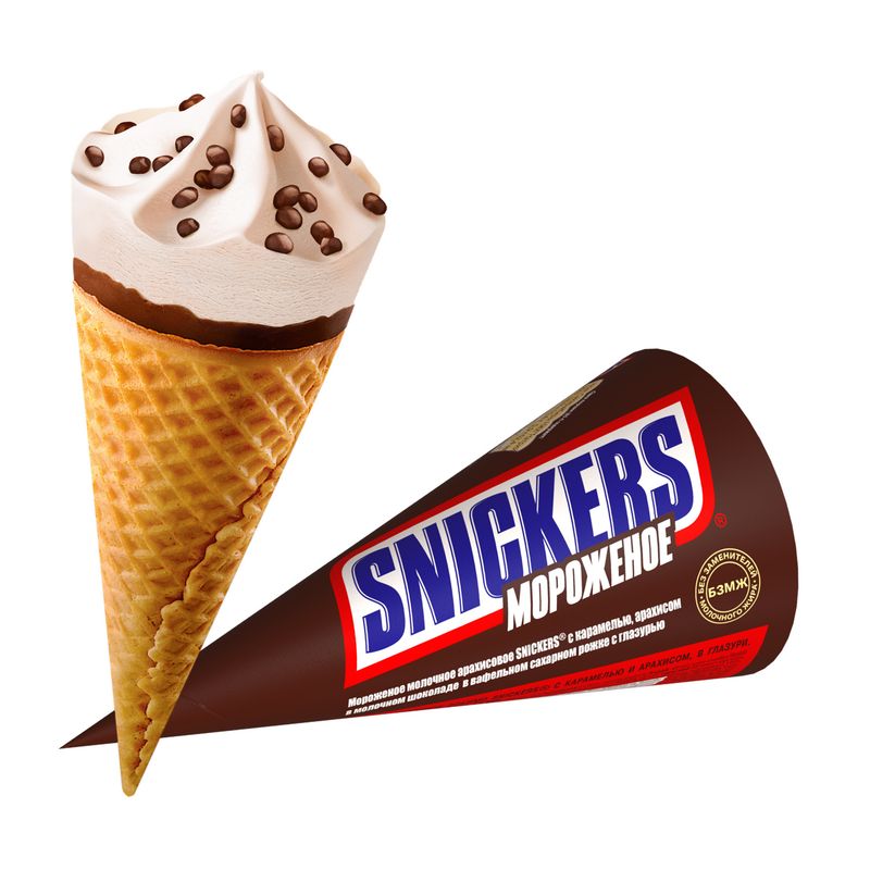 Мороженое рожок, SNICKERS — нежное сливочное мороженое с карамелью, арахисом и шоколадными шариками в хрустящем вафельном рожке. Классический вкус SNICKERS в удобной форме хрустящего рожка. Масса нетто: 69 г.