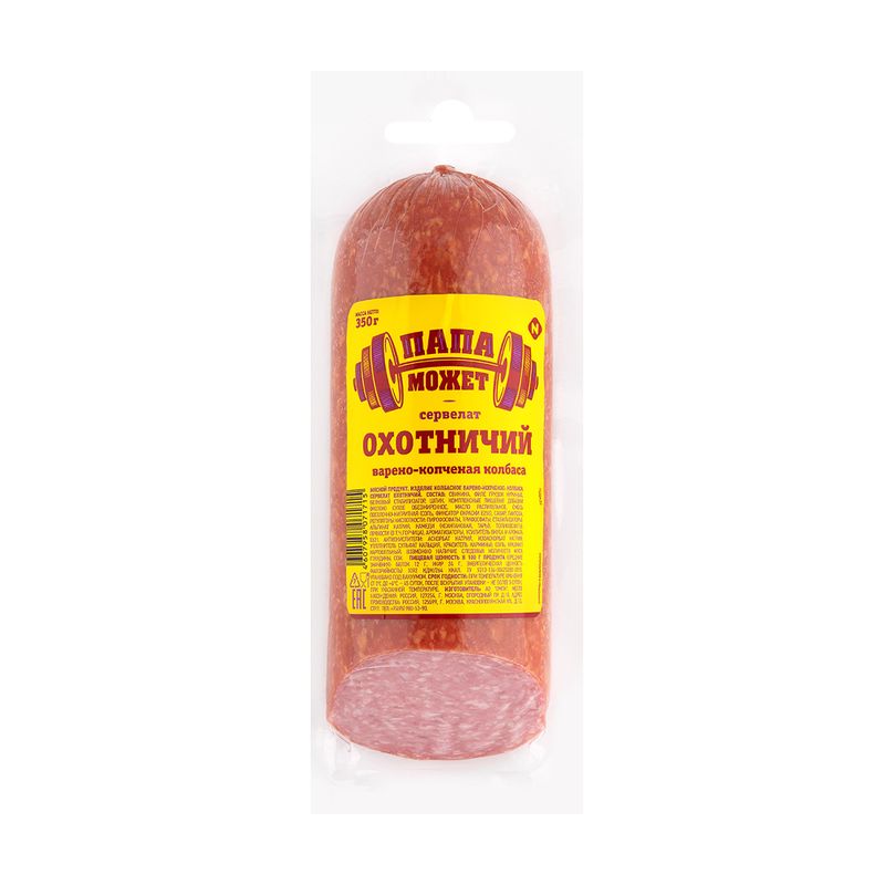 Колбаса варёно-копчёная "Сервелат Охотничий", Папа Может – это вкусный мясной деликатес, который отлично подойдёт для приготовления бутербродов и других закусок! Масса нетто: 350 г.