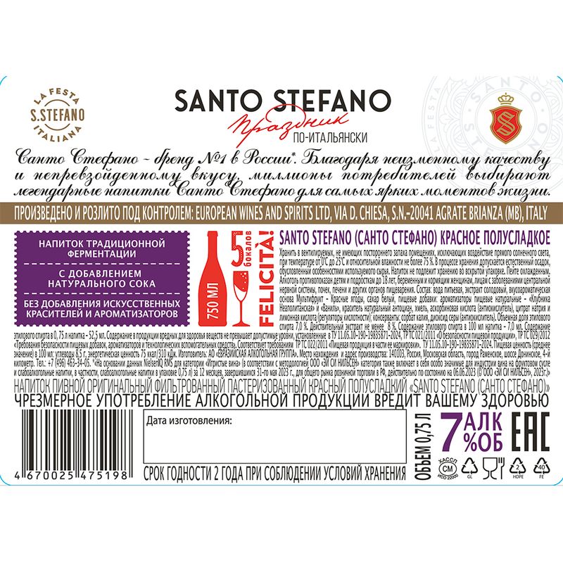 Напиток пивной оригинальный, Santo Stefano – это яркий насыщенный вкус с нотами ванили и ягод. Красный полусладкий. Подойдёт для праздничного стола. Рекомендуется пить охлаждённым. Алкоголь: 7%. Объём: 0,75 л. Чрезмерное употребление алкоголя вредит Вашему здоровью. Продажа товара возможна только лицам старше 18 лет при наличии документа, удостоверяющего личность.