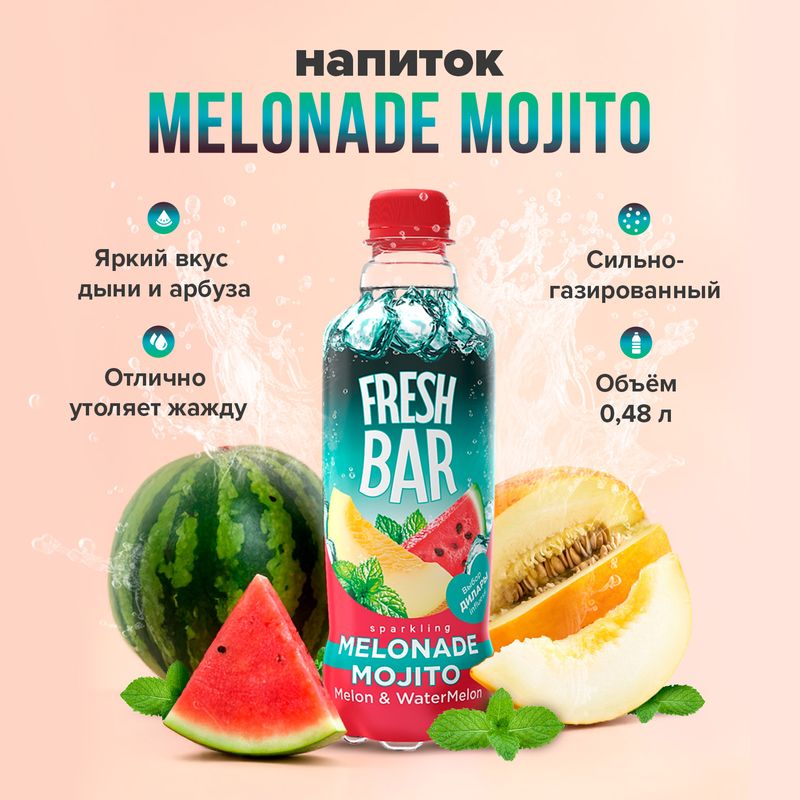 Напиток сильногазированный "Melonade Mojito", Fresh Bar, с ярким вкусом дыни и арбуза прекрасно утоляет жажду и заряжает свежестью! Объём: 0,48 л.