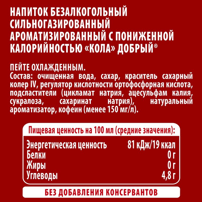 Напиток газированный, Добрый Кола – классический освежающий вкус, который отлично дополняет любимые блюда! Объём: 1 л.