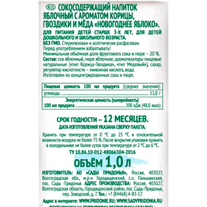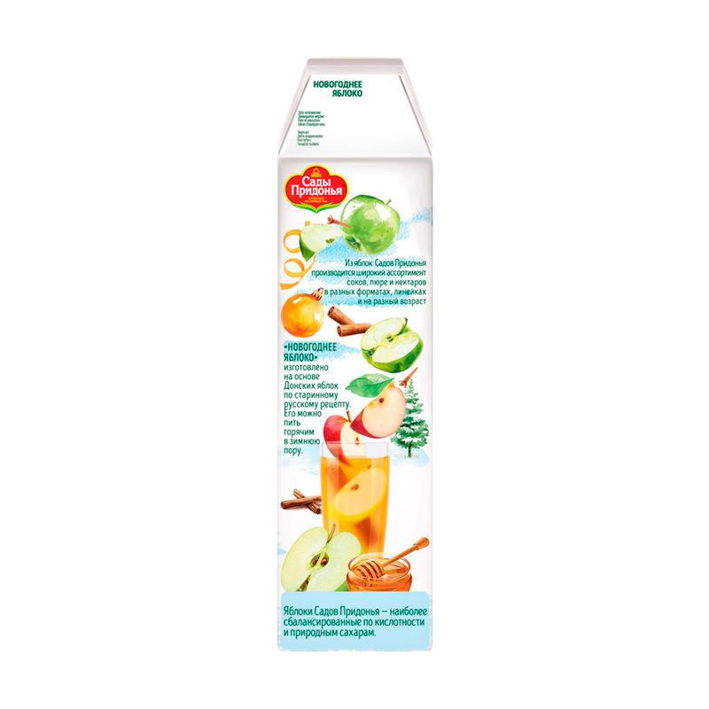 Сокосодержащий напиток "Новогоднее яблоко", Сады Придонья, с ароматом корицы, гвоздики и мёда отлично утоляет жажду и поднимает настроение! Можно пить горячим в зимнюю пору. Подходит для питания детей от 3 лет. Объём: 1 л.