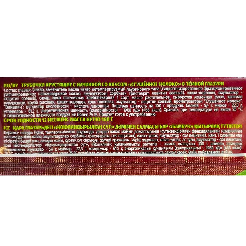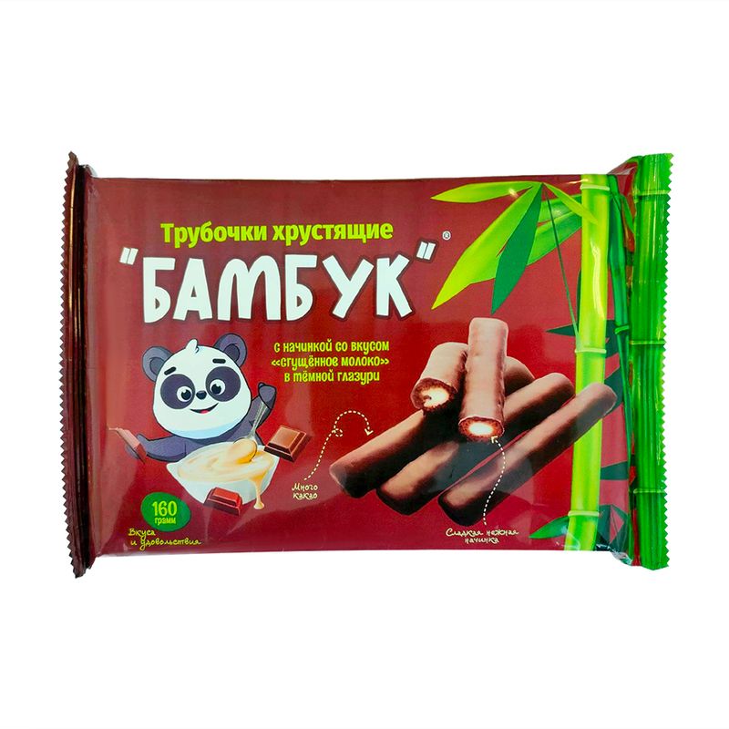 Трубочки хрустящие "Бамбук" станут отличным дополнением к чаю или кофе. Сочетание сладкой нежной начинки со вкусом сгущённого молока и шоколадной тёмной глазури подарит наслаждение любой сладкоежке! Масса нетто: 160 г.