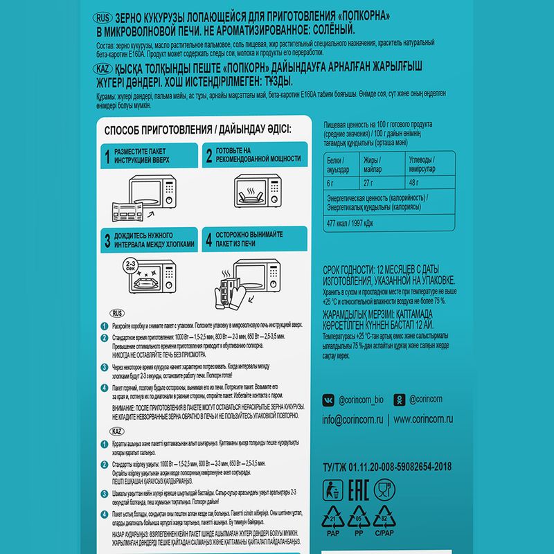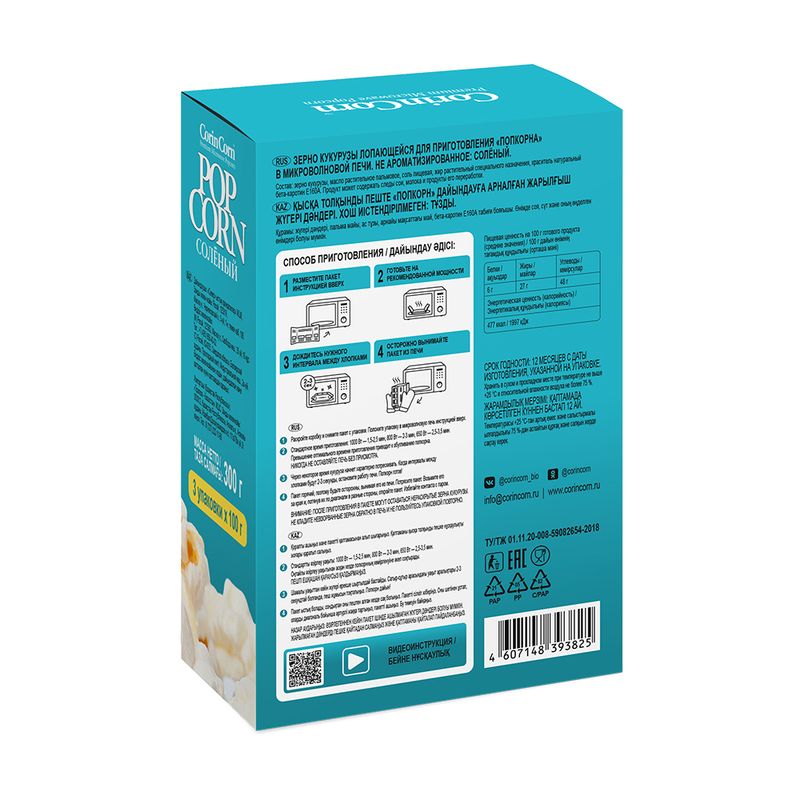 Попкорн солёный, CorinCorn, предназначен для приготовления в микроволновой печи. Отличный выбор для уютного вечера в хорошей компании! Способ приготовления указан на упаковке. Внутри 3 пакетика попкорна. Масса нетто: 300 г.