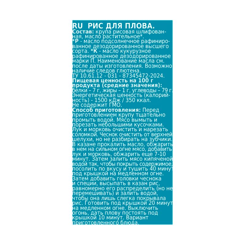 Рис для плова – отличный выбор для приготовления традиционного блюда! Подходит для восточной и азиатской кухни. Способ приготовления указан на упаковке. Масса нетто: 800 г.