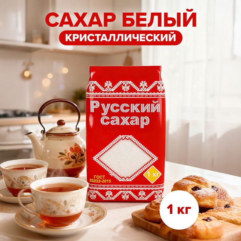 Сахар белый кристаллический, «Русский сахар», удобно использовать для приготовления выпечки и кондитерских изделий. Также станет отличным дополнением к чаю или кофе. Масса нетто: 1 кг.